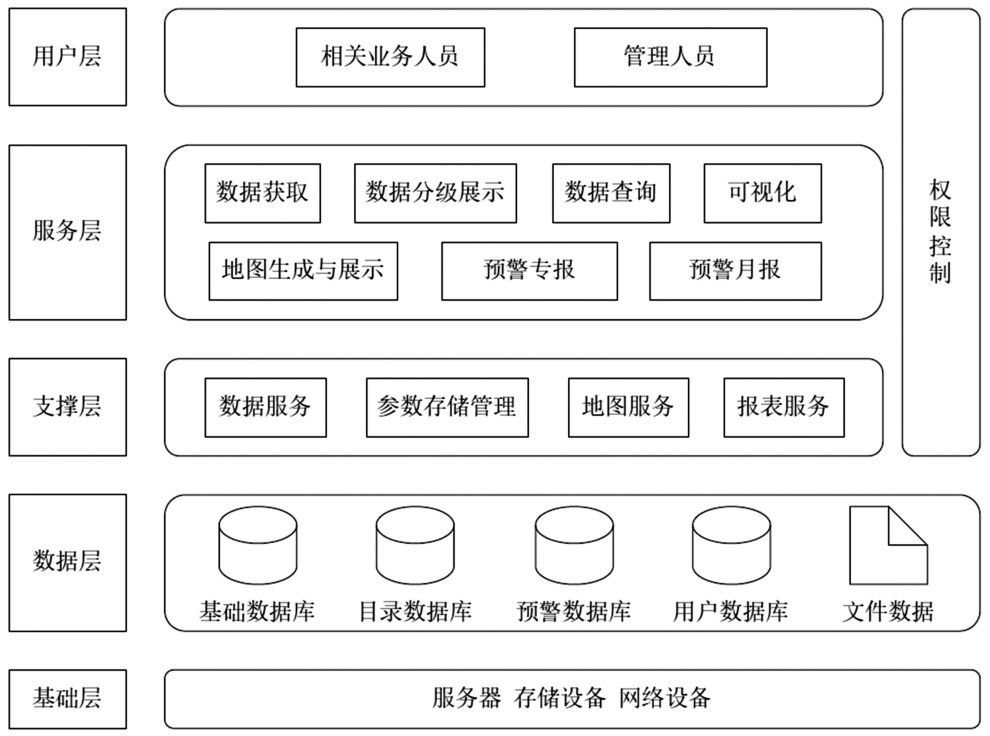 地震预警数据产出服务平台总体架构如图1所示,自下而上分为基础层、数据层、支撑层、服务层和用户层共五层。