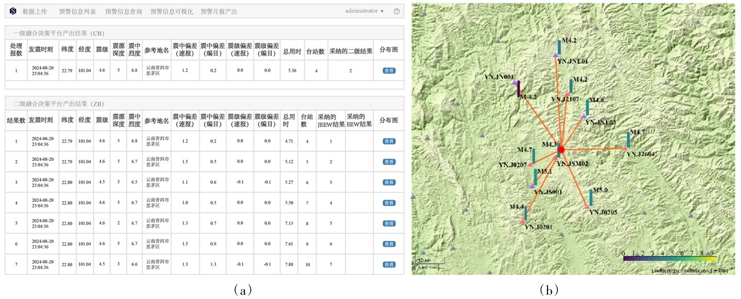 本文以国家预警备份中心在2024年8月产出的预警数据为例,展示平台的应用效果。在该时段,国家预警备份中心一级融合决策平台共产出75个地震事件,发布预警信息102条,最小预警震级为2.3级,最大预警震级为6.1级,最小预警用时为4.6 s,最大预警用时为48.8 s。第一报平均用时12.5 s,震中位置平均偏差6.6,震级平均偏差0.4。以2022年8月20日云南普洱市思茅区4.6级地震为例,国家预警备份中心一级融合决策平台共发布预警信息1条,二级融合决策平台共产出融合结果48个,JEEW和EEW子系统分别产出预警结果45个和3个。图5(a)展示了该地震事件预警产出的部分内容,根据列表可直观看到预警结果偏差情况、用时情况以及每个结果的融合来源。通过查看分布图,可以获取每个预警结果台站分布情况,如图5 (b)所示的国家预警备份中心二级融合决策平台产出的预警信息台站分布图,从图中可以清晰看到该预警信息所接收到的台站包围情况,以及每个台站测定的震级大小。其中JN001台站测定震级为负,说明该台站参数配置错误或预警产出时计算错误,方便运维管理人员进行相关故障排查。
