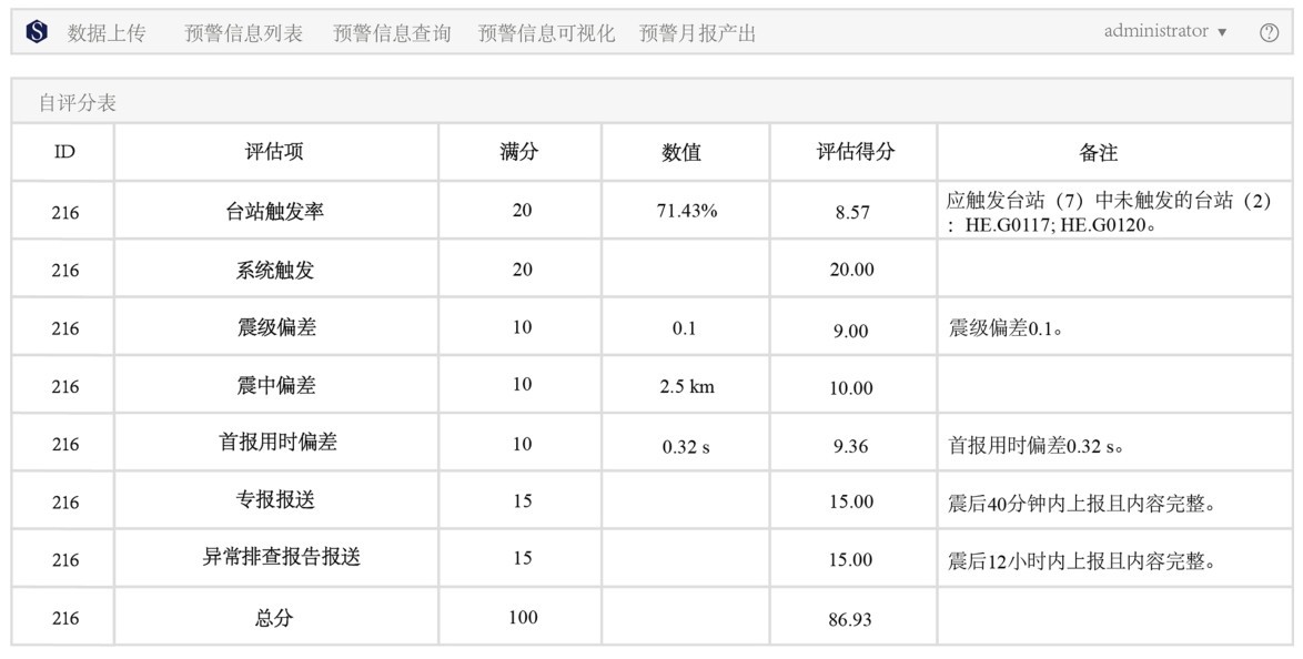 根据预警业务系统产出评估要求,平台针对预警重点区符合震级要求的地震产出进行评分。以2024年11月7日河北张家口市崇礼区3.7级地震为例,按照台站触发率、系统触发、偏差情况、报告报送情况分别进行评分,如图7所示。评分结果可作为系统产出质量评估的一项重要依据,对提升运行产出质量和效率具有重要的意义。