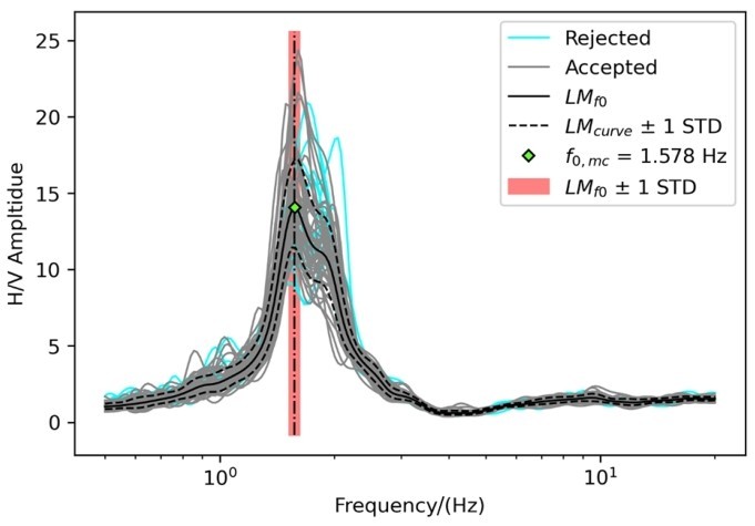 在工程地质学领域,快速且有效地估算VS30对于地震区划、地面运动预测方程和建筑规范等多个方面至关重要。然而,针对粤港澳大湾区的VS30详细研究尚未开展。先前的研究发现,可以通过基于场地基频的经验关系来估算VS30[13]。在本研究中,我们应用公式(2)来估算研究区域内的VS30。根据钻探[24]和地震成像结果[25],我们将VSL设定为200 m/s,VSb设定为1800 m/s。因此,公式(2)可以简化为: