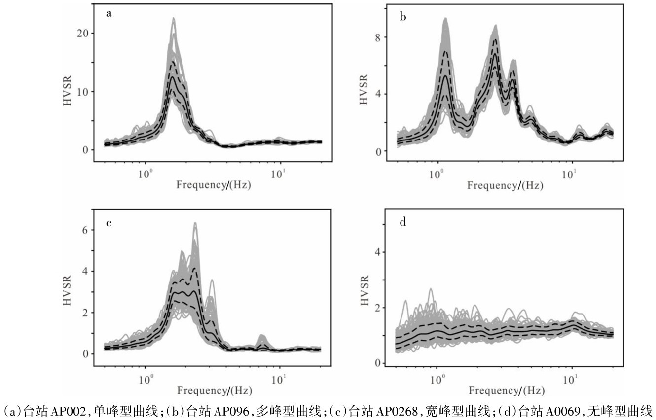 A0值大部分落在3~12范围内,并与f0呈负相关。尽管A0与研究区域的表面地质一致,但普遍认为HVSR的峰值幅度低估了场地放大效应[16]。因此,我们在后续讨论中不再讨论该参数。