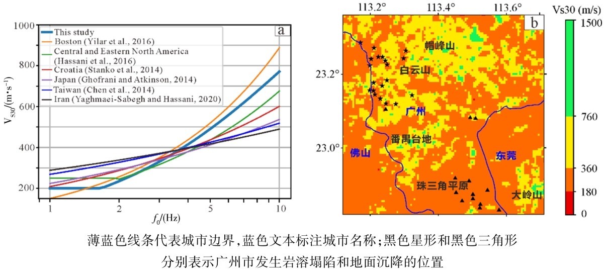 图4展示了公式(3)和其他地区使用的经验关系。这些关系之间总体有很好的相似性,但大多数其他地区相比,公式(3)在低于3 Hz时产生较低的VS30值,在高于4 Hz时产生较高的VS30值。这主要是因为粤港澳大湾区存在厚度小于50米的松散沉积层覆盖,松散层下伏坚硬的基岩,这种地质结构与波士顿地区观察到的情况相似[23],这解释了本研究中使用的经验关系与波士顿地区所用关系之间的相似性。