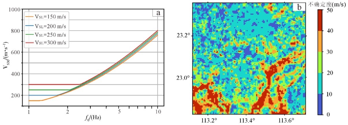 图7 VSb值为1500、1650、1800、1900和2100 m/s时,VS30与f0之间的预期关系(a)及VS30的不确定性地图(b) Fig.7 Expected relationship between VS30 and f0 for VSb values of 1500、1650、1800、1900 and 2100 m/s(a) and uncertainty map for VS3(0 b)
