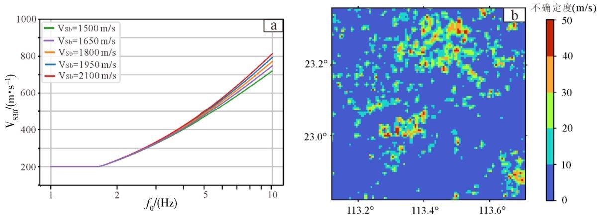 根据钻孔结果,珠三角沉积层的平均速度在100~300 m/s之间。本文首先将VSb固定为1800 m/s,分别使用150、200、250和300 m/s的VSL值,进行VS30了敏感性分析(图5a)。可以观察到,不同的VSL值对基阶频率小于2 Hz的场地VS30结果影响较大,而对超过2 Hz的场地影响则较小。将这4个不同的VSL值用于计算每个站点的VS30,每个站点可以得到4个VS30值,将4个VS30值的标准差作为该点VS30值的不确定性(图5b)。可以看到,大多数区域的VS30不确定性低于20 m/s,表明沉积层的平均速度在150~300 m/s之间取值对大部分地区的影响不大。而在古河道区域的不确定性达到了40~50 m/s,因此在评估古河道地区的VS30时应更为慎重,需结合更多钻孔数据进行约束。