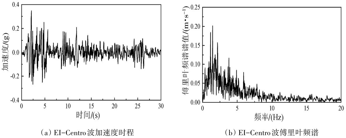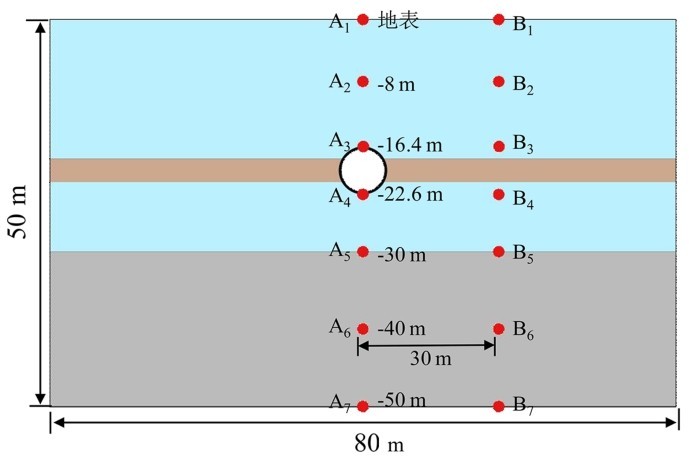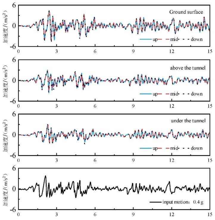为了分析土层不同位置的动态响应,如图 10所示在整个过程中沿土层深度设置了一系列监测点,图 11为土—结构相互作用系统地表处及隧道上方、下方场地水平加速度响应,可以看出场地条件对输入地震波的波形影响较小,三种场地条件下的加速度时程曲线与输入地震加速度曲线形态基本相同,在盾构隧道结构所处的土层范围内的加速度响应均显著减小,在盾构隧道结构所处的土层范围内的加速度响应均显著减小,由于输入地震动峰值较大,砂土层在下部先发生较大的剪切变形使得隧道范围内的加速度响应较大。而夹层隧道中部砂土层吸收了较大的能量使得其加速度响应最小。