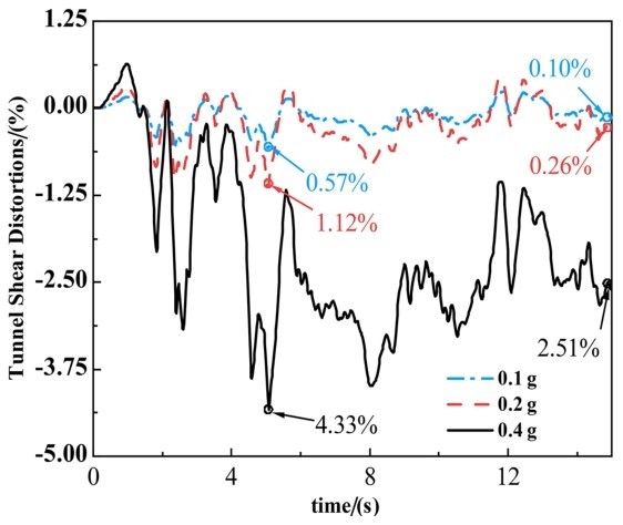 定义剪切变形为隧道顶部和底部之间的相对水平位移δu,倾角为相对水平位移与隧道直径的比值,即φ=δu/D,不同地震动强度下的剪切变形如图5所示,随着地震动强度增加拱顶与拱底特征点的相对位移也逐渐增大,剪切变形的大小与地震波振幅有关,0.1 g小震下构土体的剪切变形较小引起隧道倾角并不大仅为0.57%,说明现有强度的隧道在小震作用下能保证其安全性。随着地震波峰值加速度增加,0.4 g下盾构隧道拱顶与拱顶之间的倾角在5.05 s时达到最大值为4.33%,地震激励结束时仍产生不可恢复的塑性,这种位移差也是地震作用下结构发生剪切破坏的重要原因之一。