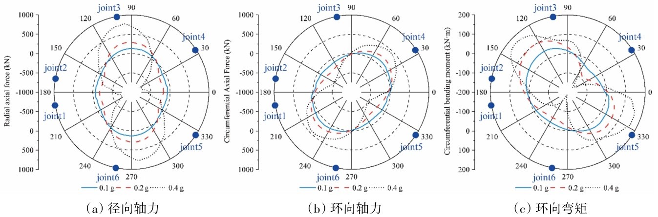 当衬砌结构产生最大剪切变形时,结构更容易发生破坏。由上文可知,最大剪切变形发生在5.05 s处,极坐标下盾构管片受力状态示意如图3所示的,不同地震动强度下盾构隧道的内力包络图如图6所示,可以看出径向内力与环向内力在隧道轴线位置出现了明显的“捏拢”现象。衬砌的内力的峰值随着地震动强度的增大而增大,以0.4 g为例,从初始时刻到管片发生最大相对位移时刻时,径向轴力增加了776.8 N,环向轴力增加了436.38 kN,弯矩增加了170.2 KN·m。由图可知节点1处环向内力、弯矩,节点5径向内力和节点3处弯矩在地震作用过程中明显增大,说明地震作用下衬砌连接处的相互错动对内力的分布影响较大,也是地震作用中的不利位置。
