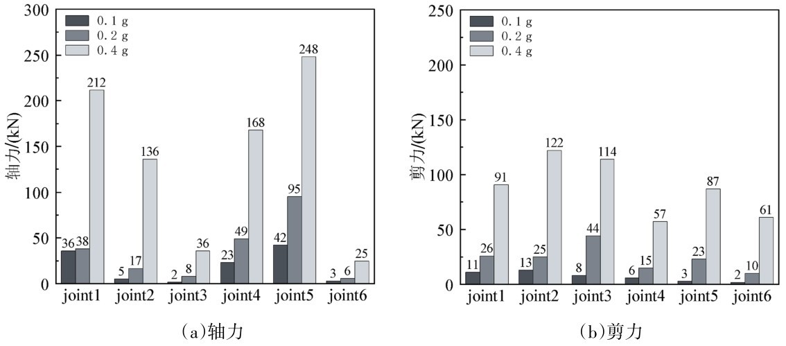 同样的管片的变形导致接头的张开、压紧、错位进而影响连接螺栓的内力分布。如图9为不同地震动强度下接头螺栓的轴力、剪力。可以看出轴力剪力的数值规律比较符合相对应的接缝变形量,以0.4 g为例,最大值轴力248 kN对应节点5处的最大内开口量,剪力最大值122 kN对应节点2处的剪切错动量。地震作用下接头螺栓的剪力小于其轴力0.2 g地震激励作用下的螺栓内力相对于0.1 g地震激励作用下并没有明显提高,说明管片在小中震下其接头变形发育较慢,接缝的防水性与完整性能够得到保证,而在大震地震激励下内力发展较快,地震激励作用下盾构衬砌结构在拱腰、拱脚的连接螺栓的内力较大,容易发生破坏。