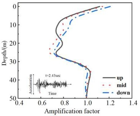图 12为不同场地条件下土—结构相互体系加速度放大系数PGA沿深度变化情况,三种场地条件下加速度放大系数沿深度均呈现先线性减小后线性增大的趋势,这是由于土体自重应力及材料非线性发展消耗了大量的地震波的能量,而随着埋深的减小上覆土体的自重应力减弱,加速度的幅值也会逐渐增大,夹层在中部加速度响应小于另外两种场地,相较于夹层在上部加速度响应降低了10.1%,相对于夹层在下部降低了6.1%。