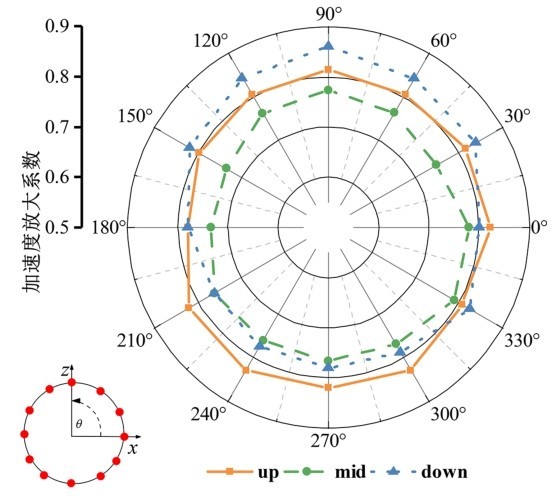 沿隧道管片圆周每30°布置一个监测点,图 13显示了三种场地条件下盾构隧道各监测点的加速度放大系数响应包络图。不同场地条件对盾构隧道加速度影响较大,场地三夹层在下部的最大加速度响应出现在拱顶,而场地一夹层在上部出现在拱底,这是由于盾构隧道受地层相对运动影响,隧道结构加速度与围岩运动发展规律基本一致。