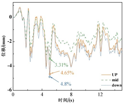 图5 拱顶与拱底剪切变形时程曲线Fig.5 Time history curves of the shear deformation of arch vault and arch bottom under different seismic loads