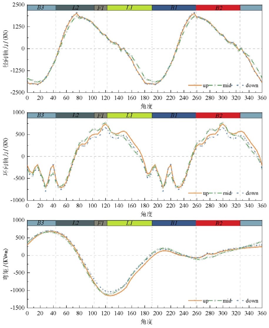 为进一步探明不同场地下盾构隧道结构在地震作用下的抗震性能差异,定义管片局部极坐标系,局部极坐标下盾构管片受力状态示意如图3所示的,提取盾构隧道管片环向90个截面的内力,不同场地条件下盾构隧道的环向内力包络图如图 15所示,可以看出在0.4 g地震激励作用下三种场地条件的内力包络图分布趋势相近,径向轴力与环向轴力仍呈反对称规律,而弯矩由于土的非线性行为及管片接缝的张开引起内力重分布。结构的内力在管片接缝处集中,由图可知节点1处环向内力、弯矩,节点5径向内力在地震作用过程中明显增大,说明地震作用下衬砌连接处的相互错动对内力的分布影响较大,也是地震作用中的不利位置。由于夹层在下部在地震激励时砂土产生较大的非线性吸收了地震波能量,其弯矩与内力均有一定减小。而夹层在隧道中部由于砂土的刚度与软土有差别使得环向轴力有所增大。