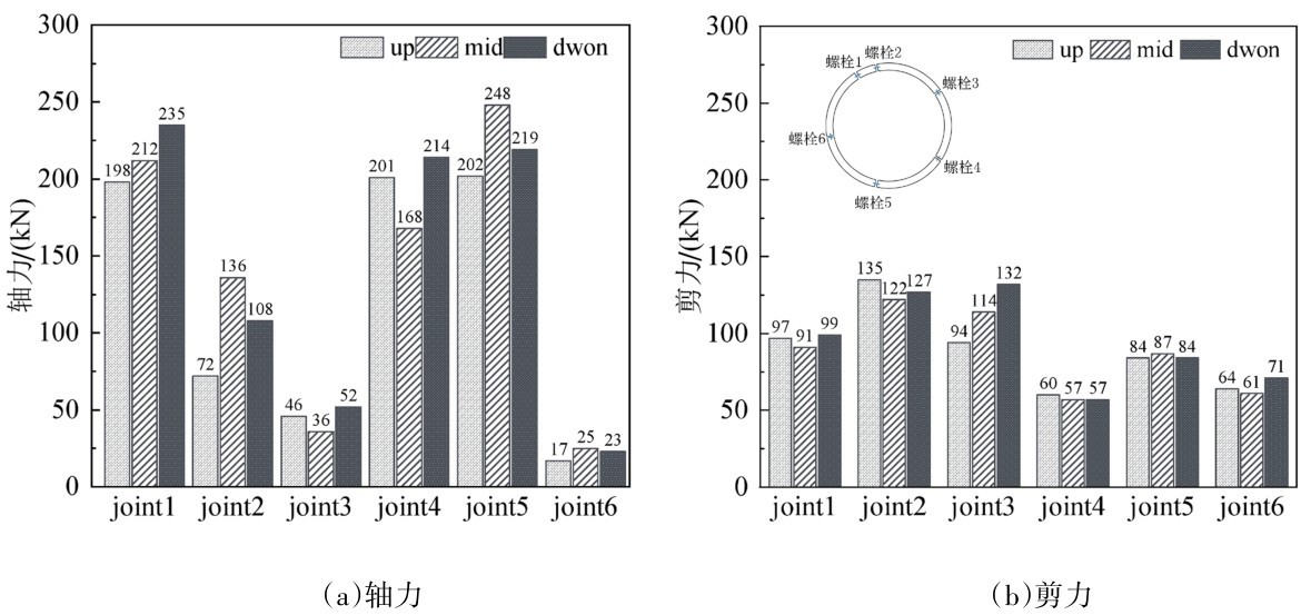 图 17 场地一连接螺栓的轴力、剪力时程曲线Fig.17 Time history curves of axial and shear forces of the connecting bolts in Site 1